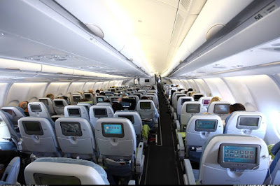 Judging from the look at the number of passengers at the waiting room, it looked like a full flight on both Y and J class. It was indeed a full flight after exploring around the cabins during the flight. The usual boarding announcement was made and I was one of the first to board the aircraft. Making my way down the aerobridge and I was greeted by a pair of crew welcoming me on board. I realized that the interior is different from the A340-300. The seat colour and the size of the PTV was bigger and if you ask me, I pick this interior over the A340's. This airline also has a new business class cabin.