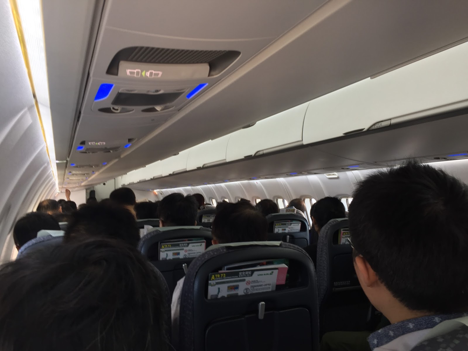 Once onboard, I have to mind my heard as the ceiling is quite low with the narrow aisle which makes it difficult to walk past someone. When I got to my row, there was someone else sitting at the aisle seat. What I notice after the door was closed was the middle rows of seats were vacant while the front and the rear rows were almost full, as this is to balance the aircraft.